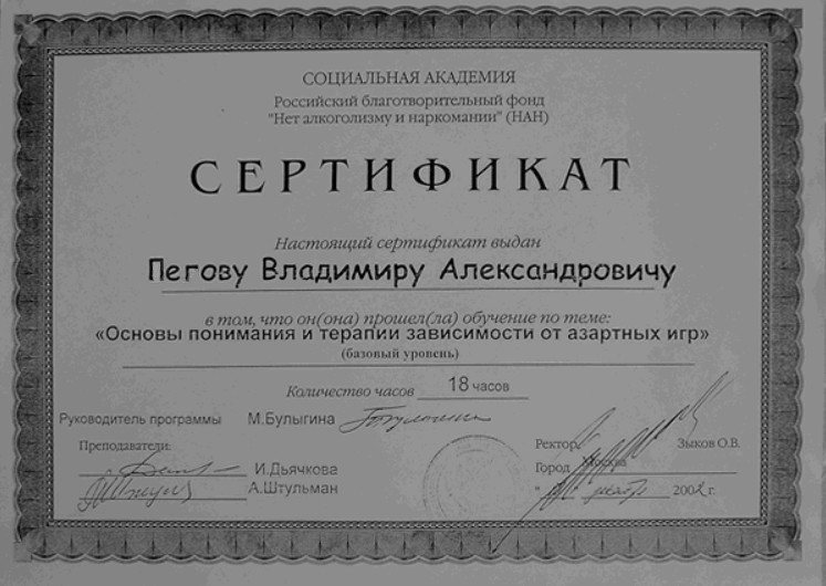 Его дополнительные курсы и профессиональная переподготовка охватывают широкий спектр современных подходов к лечению зависимостей, включая игроманию и табакокурение. Обучение в лучших образовательных учреждениях России позволило ему стать настоящим экспертом в своей области.